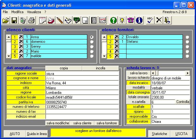 | La finestra principale del software in cui si visualizzano i clienti, i fornitori e le schede di lavoro di ciascuno di essi. |