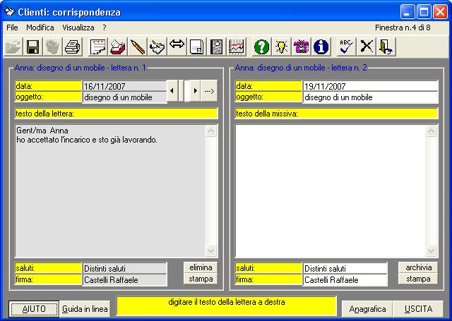 Il software è organizzato per archiviare, nella attuale versione, fino a 1000 clienti e fino a 1000 fornitori con 100 schede di lavoro per ciascuno e fino a 100 lettere per ogni scheda. Si articola in 8 finestre principali corrispondenti alle funzioni indicate appena sotto il titolo di questa pagina. La finestra riportata in immagine in questa pagina riguarda la corrispondenza. Le lettere scritte possono essere stampate ed archiviate comodamente. Qualora esiste già una lettera ricorrente è possibile richiamarla, utilizzando la barra di scorrimento nella tabella di sinistra ed inviarla sulla destra cliccando sula tasto con la freccetta e, quindi, modificare solo la data o integrare il testo. La stampa viene esporta su Word e formattata automaticamente. Ulteriori approfondimenti sul funzionamento e sulle opzioni presenti nelle altre finestre del programma CLIENTI sono disponibili nelle pagine successive.