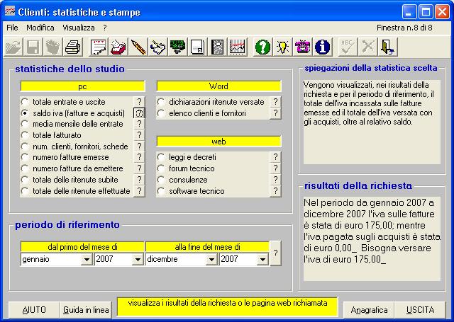 Il software è organizzato per archiviare, nella attuale versione, fino a 1000 clienti e fino a 1000 fornitori con 100 schede di lavoro per ciascuno e fino a 100 lettere per ogni scheda. Si articola in 8 finestre principali corrispondenti alle funzioni indicate appena sotto il titolo di questa pagina. La finestra riportata in immagine in questa pagina riguarda la visualizzazione dei dati statistici elaborati in base all'archivio presente. Per molte opzioni è necessario anche scegliere il periodo di riferimento. Ad esempio per il saldo IVA nel caso del pagamento mensile o trimestrale. E' possibile ottenere automaticamente le dichiarazioni annuali sulle ritenute d'acconto versate per i fornitori o l'elenco dei clienti e fornitori per il fisco. Molto utile è il collegamento diretto con alcune paguine web dove trovare informazioni sull'attività porfessionale dello studio. I tasti con il punto interrogativo (?) mostrano spiegazioni sulla singola opzione. Ulteriori approfondimenti sul funzionamento e sulle opzioni presenti nelle altre finestre del programma CLIENTI sono disponibili nelle pagine successive.