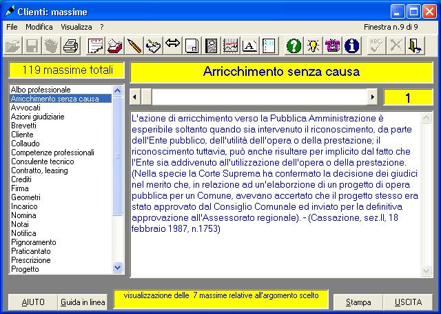 Il software è organizzato per archiviare, nella attuale versione, fino a 1000 clienti e fino a 1000 fornitori con 100 schede di lavoro per ciascuno e fino a 100 lettere per ogni scheda. Si articola in 10 finestre principali corrispondenti alle funzioni indicate appena sotto il titolo di questa pagina. La finestra riportata in immagine in questa pagina riguarda la visualizzazione delle massime sull'attività professionale. Esse possono essere scelte tra numerosi argomenti aggiornati annualmente. Per molte opzioni è necessario anche scegliere il periodo di riferimento. Ad esempio per il saldo IVA nel caso del pagamento mensile o trimestrale. E' possibile ottenere automaticamente le dichiarazioni annuali sulle ritenute d'acconto versate per i fornitori o l'elenco dei clienti e fornitori per il fisco. Molto utile è il collegamento diretto con alcune paguine web dove trovare informazioni sull'attività porfessionale dello studio. I tasti con il punto interrogativo (?) mostrano spiegazioni sulla singola opzione. Ulteriori approfondimenti sul funzionamento e sulle opzioni presenti nelle altre finestre del programma CLIENTI sono disponibili nelle pagine successive.