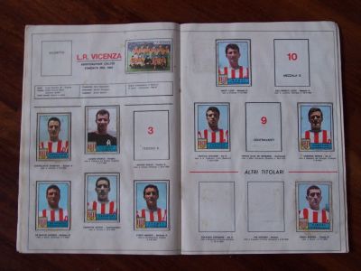 L.R. Vicenza dell'album del 63-64 figurine mancanti: scudetto, Savoini Giulio, Dell'Angelo Lucio, Vinicio (Luis De Menezes), Colausig Giordano, Pin Antonio Lazio dell'album del 63-64 figurine mancanti: Cei Idilio figurine inserite di altra annata: Rozzoni Orlando, Governato Nello Mantova dell'album del 63-64 figurine mancanti: scudetto, Morganti Carlo, Schnellinger Karl Heinz, Recagni Ettore figurine inserite di altra annata: Zoff Dino, Giagnoni Gustavo altre immagini dell'album: