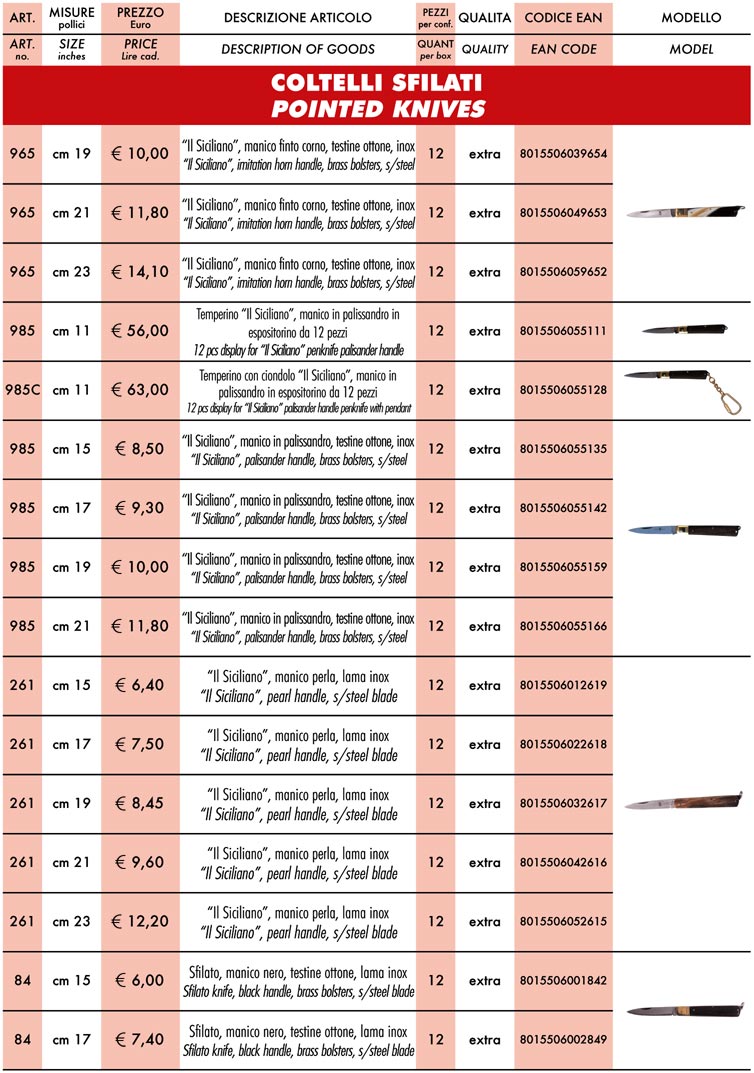 un coltello artigianale, non solo per intenditori e collezionisti degli attrezzi da taglio, è comunque un oggetto di valore, sia per l'uso giornaliero che per conservarlo come ricordo o come un utensile di qualità; i coltelli da tasca con manico in corno presentati in questa pagina sono tra i migliori della produzione relativa allo sport; per visualizzare le immagini ingrandite clicca qui. Le confezioni sono da dodici pezzi, ma puoi comprare anche un solo pezzo (solo attraverso questo sito). Se sei un rivenditore contattaci: potrai avere degli adeguanti sconti, secondo la quantità di merce che ti occorre. Le spedizioni avvengono giornalmente e riceverai ciò che hai acquistato in due o tre giorni al massimo. Per acquisti aldisotto di 100 euro devi aggiungere 10 euro per le spese del corriere.  Sopra i 100 euro ti regaliamo il trasporto: calcola solo il costo degli articoli scelti. Non dimenticare che hai scelto un'azienda di Frosolone: un nome nella storia delle lame, delle forbici e dei coltelli.
