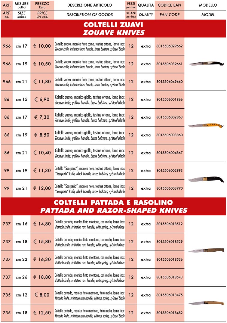 un coltello artigianale, non solo per intenditori e collezionisti degli attrezzi da taglio, è comunque un oggetto di valore, sia per l'uso giornaliero che per conservarlo come ricordo o come un utensile di qualità; i coltelli da tasca con manico in corno presentati in questa pagina sono tra i migliori della produzione relativa allo sport; per visualizzare le immagini ingrandite clicca qui. Le confezioni sono da dodici pezzi, ma puoi comprare anche un solo pezzo (solo attraverso questo sito). Se sei un rivenditore contattaci: potrai avere degli adeguanti sconti, secondo la quantità di merce che ti occorre. Le spedizioni avvengono giornalmente e riceverai ciò che hai acquistato in due o tre giorni al massimo. Per acquisti aldisotto di 100 euro devi aggiungere 10 euro per le spese del corriere.  Sopra i 100 euro ti regaliamo il trasporto: calcola solo il costo degli articoli scelti. Non dimenticare che hai scelto un'azienda di Frosolone: un nome nella storia delle lame, delle forbici e dei coltelli.