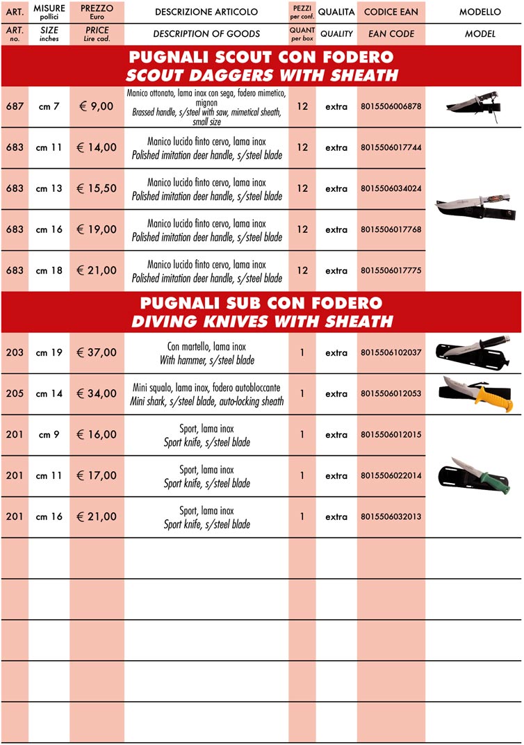 un coltello artigianale, non solo per intenditori e collezionisti degli attrezzi da taglio, è comunque un oggetto di valore, sia per l'uso giornaliero che per conservarlo come ricordo o come un utensile di qualità; i coltelli da tasca con manico in corno presentati in questa pagina sono tra i migliori della produzione relativa allo sport; per visualizzare le immagini ingrandite clicca qui. Le confezioni sono da dodici pezzi, ma puoi comprare anche un solo pezzo (solo attraverso questo sito). Se sei un rivenditore contattaci: potrai avere degli adeguanti sconti, secondo la quantità di merce che ti occorre. Le spedizioni avvengono giornalmente e riceverai ciò che hai acquistato in due o tre giorni al massimo. Per acquisti aldisotto di 100 euro devi aggiungere 10 euro per le spese del corriere.  Sopra i 100 euro ti regaliamo il trasporto: calcola solo il costo degli articoli scelti. Non dimenticare che hai scelto un'azienda di Frosolone: un nome nella storia delle lame, delle forbici e dei coltelli.
