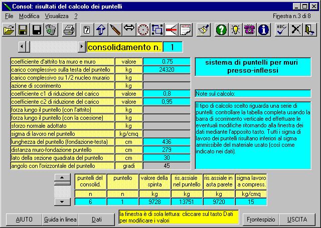 Il pacchetto completo comprende i puntelli, la cui finestra dei risultati è riportata in alto, i tiranti, la cerchiatura di colonne e pilastri (con ferri posti a caldo o a freddo), i tirantini antiespulsivi. Possono essere acquistati i singoli moduli anche separatamente. Nel caso dei puntelli è previsto il consolidamento per dissesti combinati, per muri presso-inflessi, per angolate con l'ausilio anche di un nucleo murario. Viene inoltre richiesto, oltre ai dati tecnici sull'intervento, di scegliere tra una serie di opzioni preimpostate relative alle condizioni della muratura ed alle lesioni presenti. I risultati sono immediati e visibili in una finestra successiva (riportata come esempio in alto in questa pagina). E' possibile tornare alla pagina dei dati ed apportare le dovute modifiche, se necessarie, oppure stampare la relazione o archiviare tutto. Il programma consente di elaborare una serie di consolidamenti diversi, praticamente facenti parte dello stesso edificio o dello stesso progetto. Difatti una barra di scorrimento visualizza sia i dati che i risultati del numero del consolidamento studiato. Il software, adatto ai tecnici dell'edilizia, è utile anche per le imprese che operano nel campo delle ristrutturazioni e del restauro e per gli uffici tecnici degli enti pubblici che spesso si trovano ad intervenire, talora con urgenza, sul proprio patrimonio immobiliare.
