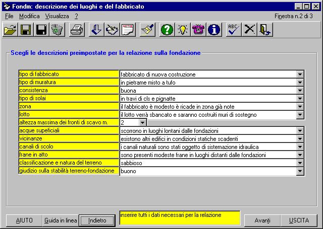 Se si è in possesso del sigma del terreno basta inserirlo per controllare i risultati, altrimenti il programma consente di scegliere tra tre tipi di suolo (sabbioso, compatto, intermedio) e di digitare solo i dati del peso specifico e della coesione per calcolare automaticamente il carico limite e quindi il sigma ammissibile. Un tasto consente di incrementare la larghezza della base fondale in modo automatico fino a trovare il necessario coefficiente di sicurezza. La finestra riportata in alto riguarda la descrizione del fabbricato da utilizzare per la redazione automatica della relazione sulla fondazione, così come richiesta dalle normative vigenti. Tutti i dati possono essere scelti tra una serie di situazioni preimpostate visibili cliccando sulla rispettiva freccetta, usando il solo mouse. Il tutto viene, pertanto, redatto in qualche minuto, sia nel caso di un progetto ex novo che per il controllo e la verifica di una struttura preesistente. Il software FONDM è utilissimo non solo per i tecnici progettisti, ma anche per l'impresa, che operi soprattutto nelle ristrutturazioni, e per l'ufficio tecnico degli enti pubblici. Il costo contenuto è riportato nella nostra pagina del listino. Ogni finestra ha un tasto per controllare i dati immessi o per cancellare tutto, in ogni caso un'apposita casella di testo indica passo dopo passo la procedura per la corretta introduzione dei dati. Si possono archiviare tutti i dati per una elaborazione futura o per eventuali modifiche.
