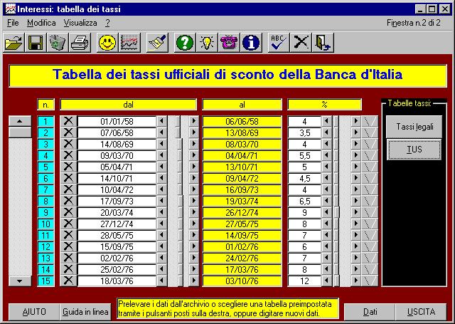 Molto importante è l'aiuto che fornisce la finestra sopra riportata e riguardante i tassi applicabili al caso. Si possono costruire tabelle personali di tassi o integrare quelle già preimpostate sui tassi legali e sul tasso ufficiale di sconto. Il calcolo è molto semplice ed è alla portata di tutti: non è necessario essere particolarmente esperti della materia. E' questo il motivo che ha permesso al software INTERESSI di essere acquistato anche dai semplici cittadini che abbiano problemi di computo di tassi, interessi, rimborsi, mutui, risarcimenti, ecc. Particolarmente utile è questo programma per il calcolo degli interessi composti, specialmente quando il tasso debba essere modificato durante l'anno solare. Manualmente diventerebbe una elaborazione onerosa e difficilmente precisa. Con le nuove direttive sugli interessi per ritardato pagamento, sia con riferimento alle imprese che ai professionisti, diventa troppo stressante applicarsi per ore per elaborare conti al riguardo. INTERESSI, semplice e potente, aiuta al costo di circa un'ora di lavoro di un qualsiasi impiegato. Vedi il nostro catalogo. Puoi scaricarlo qui. Puoi acquistarlo in un minuto in questa pagina.
