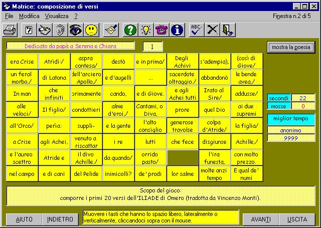 nel gioco della finestra Versi: a partire dall'Iliade (primi versi) alla