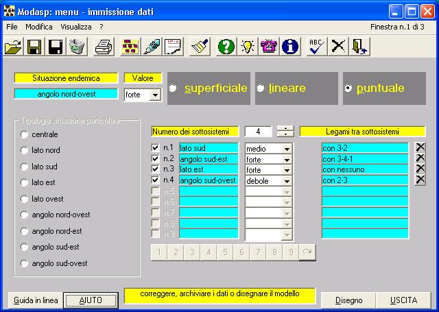 a) superficiale; b) lineare; c) puntuale; 2) valore della tipologia; a) debole; b) medio; c) forte; 3) tipologia situazione; (9 scelte preimpostate) 4) numero dei sottosistemi; 5) tipi (da scegliere tra 9 tipologie preimpostate); 6) valore; a) debole; b) medio; c) forte; 7) legami per ogni sottosistema (da sciegliere tra tipi esistenti); 8) dati di progetto (per l'archivio e/o la stampa).