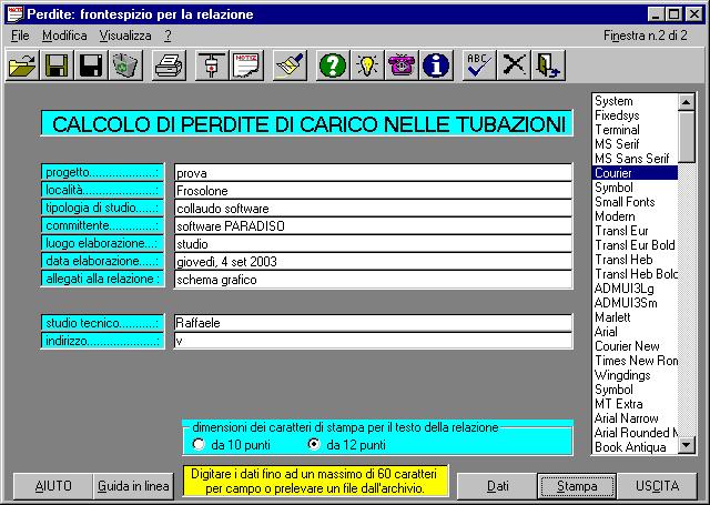 La tipologia del tubo utilizzato nell'impianto può essere scelta tra alcuni dati preimpostati che determinano l'automatico inserimento del valore della scabrezza. Il software è molto intuitivo e di semplice utilizzo: può essere usato immediatamente. E' possibile calcolare fino a 500 tronchi diversi. Si possono modificare a piacere i dati per controllare differenti risultati e soluzioni. Il programma stampa anche una relazione con tutti i dati e i risultati della elaborazione eseguita. In questa pagina è riportata un'immagine della finestra dedicata ai dati necessari per la relazione. Ogni calcolo può essere archiviato a piacere e richiamato per la stampa, la modifica o la continuazione della digitazione. Con l'ultima versione è stata migliorata la grafica delle finestre di calcolo, sono stati inseriti numerosi controlli automatici e alcuni tasti per la gestione di input, sono stati precisate tutte le didascalie. Il costo (vedilo nel nostro catalogo) è molto contenuto, grazie anche al considerevole numero di installazioni eseguite.