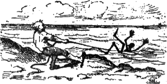 E cominciò a tirare la fune, con la quale lo aveva legato per una gamba: e tira, tira, tira, alla fine vide apparire a fior d'acqua... indovinate? Invece di un ciuchino morto, vide apparire a fior d'acqua un burattino vivo che scodinzolava come un'anguilla.