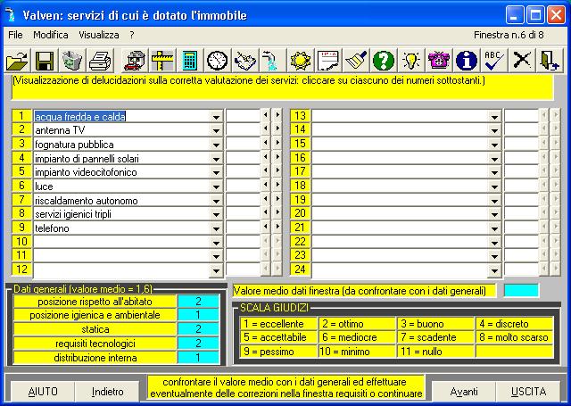 La finestra riportata in alto riguarda i dati sui servizi presenti nel fabbricato. Con essi, necessari per la relazione, è anche possibile effettuare un confronto con i giudizi espressi nelle caratteristiche della costruzione. Se necessario si può tornare alla finestra iniziale e fare le opportune correzioni. Diversamente si può tralasciare questa fare ed andare avanti. In pratica il programma comunque, in ogni momento, mette l'operatore in condizioni di essere il più preciso possibile nella stima, di esprimere giudizi pertinenti, di ottenere un prezzo anche diverso da quanto creduto esatto inizialmente. Nel caso che non sia reperibile facilmente il suddetto prezzo elementare o non sia, comunque, a conoscenza dell'utente il software VALVEN fornisce adeguati strumenti di aiuto. Sarà possibile facilmente e, possibilmente adoperando anche internet, attingere a fonti perfettamente attendibili in base alla zona ed ai requisiti indicati. Tale fonti sono costantemente aggiornate. Il tecnico che usa VALVEN, ma anche un operatore non necessariamente esperto in valutazioni, avrà sempre disponibili aiuti di ogni genere per poter formulare correttamente una stima e una relazione scritta. Il programma è stato installato in studi di ingegneri, architetti, geometri, agronomi, periti edili ed altri professionisti, ma anche presso imprese, uffici tecnici comunali o privati cittadini. La sua versatilità e la possibilità di aggiornamento gratuito che forniamo lo rendono uno strumento utile e prezioso: lo puoi valutare facilmente anche tu, basta scaricarlo da qui.