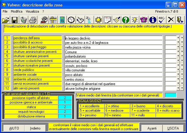 1) giudizio (da una scala preimpostata); 2) valore (automatico); 3) coefficiente (automatico); 4) peso del giudizio (%); 5) dati della elaborazione (per l'archivio e/o la stampa). (per ogni ambiente) 1) nome; 2) numero delle parti simili (eventuali); 3) superficie netta; 4) ragguaglio; 5) sup.netta ragguagliata (automatico); (per la stima finale) 1) prezzo elementare; (per la descrizione dell'immobile - dati sceglibili in liste preimpostate) 1) destinazione d'uso; 2) numero massimo dei piani; 3) struttura principale; 4) tipo di solai; 5) tipo di copertura; 6) rispetto della normativa antisismica; 7) vincoli presenti; 8) periodo di costruzione; 9) tipo di pavimenti; 10) tipo di infissi; 11) servitù attive; 12) servitù passive; (descrizione dei servizi presenti) 1) sceglibili in una lista preimpostata e/o inputabili fino a 24 dati diversi; (per la descrizione della zona) 1) pendenza dell'area; 2) possibilità di accesso; 3) possibilità di parcheggio; 4) strutture amministrative presenti; 5) strutture sanitarie presenti; 6) strutture scolastiche presenti; 7) strutture ricreative presenti; 8) verde pubblico; 9) ambiente sociale; 10) ambiente urbanistico; 11) servizi economici presenti; 12) altri servizi presenti; (per la relazione) 1) Comune; 2) località; 3) indirizzo; 4) proprietà; 5) committente; 6) luogo della perizia; 7) data della perizia; 8) allegati alla relazione; 9) studio tecnico.