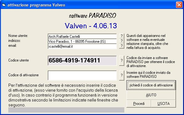 Il software può essere scaricato direttamente da una delle nostre pagine (ad esempio dal catalogo), l'acquisto può essere effettuato compilando l' apposito modulo. Il pagamento può avvenire con bonifico bancario, con vaglia postale o con carta di credito, come è specificato in questa pagina. I programmi funzionano con un codice di attivazione (vedi l'immagine in basso) che ti forniamo dopo che ci hai inviato la copia del pagamento. Se vuoi possiamo anche mandarti direttamente il software via email. |